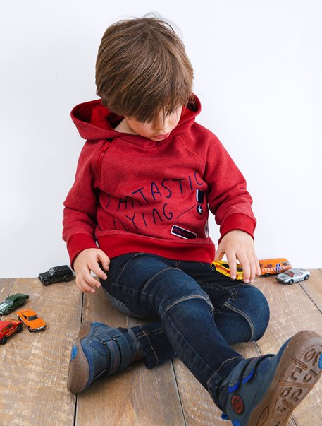 Kapuzen-Sweatshirt für Jungen: Rot: reine Baumwolle. Grau: 95 % Baumwolle, 5 % Viskose. Kapuzenfutter reine Baumwolle.