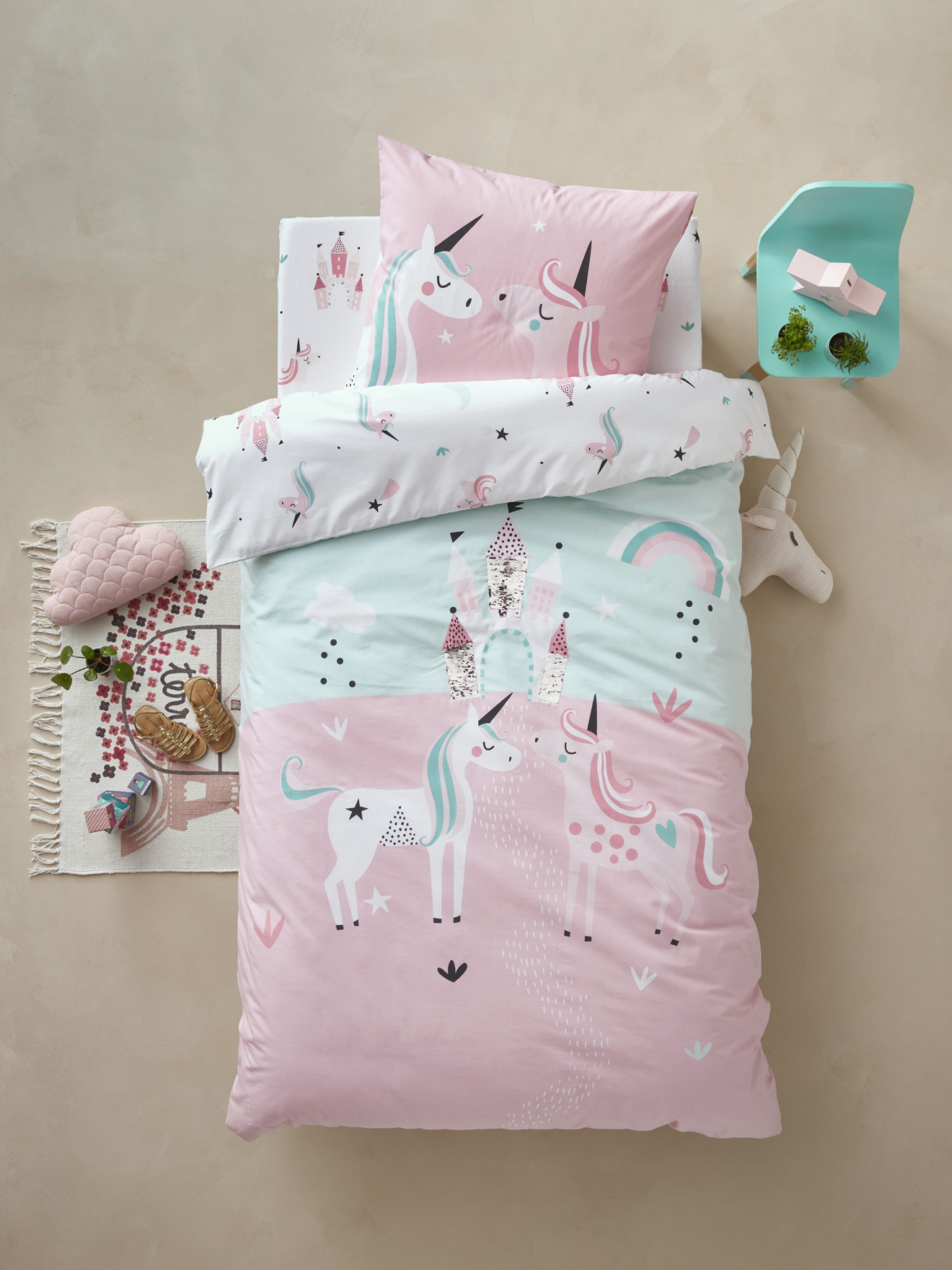 - Une face entièrement imprimée motifs licornes, château et étoiles sur fond blanc